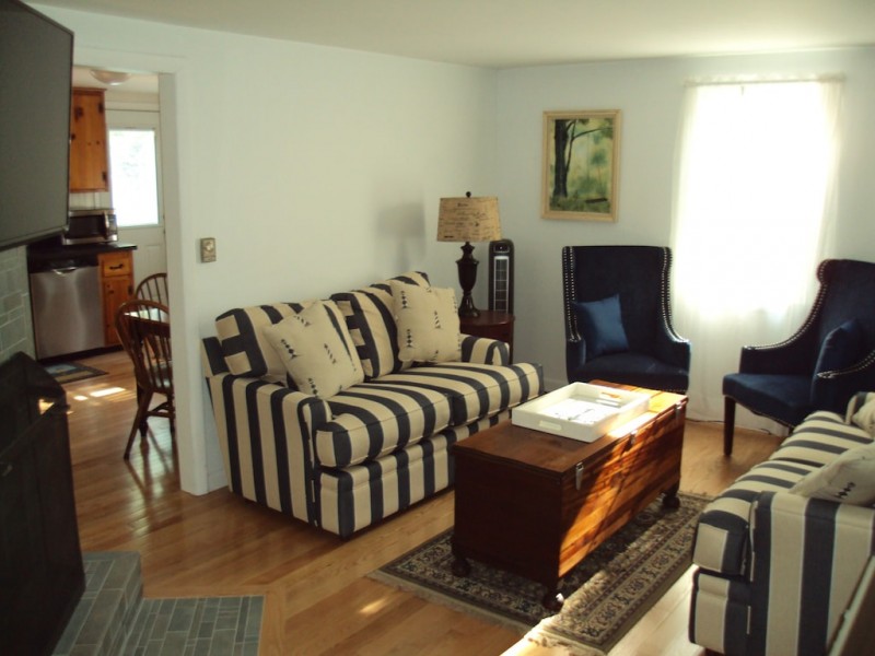 This Cape Cod Cottage has 2 bedrooms, one full bath home and an equipped eat in kitchen. A comfortable living room set up with 2 love seats, 2 side tables with lamps, 2 sitting chairs, a flat screen smart tv, coffee table and WIFI. The fireplace is decorative and however, not functional at this time. Both bedrooms have freshly cleaned carpeting and the living room, hall and kitchen have new hardwood floors.