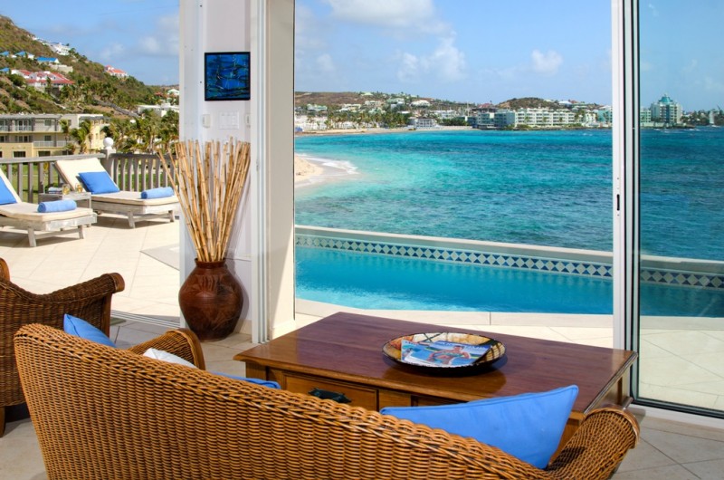 The upper level offers stunning views from the living, dining and kitchen areas. The villa boasts a custom kitchen with modern stainless steel appliances and brightly colored blue tile which nicely compliments the white shutter cabinet door. The living and dining areas are truly indoor/outdoor. The entire wall of the villa facing the pool and sea is made of sliding doors that open almost the entire wall of the villa facing the pool and sea is made of sliding doors that open almost the entire length of the wall creating spectacular views from everywhere on the upper level of the villa.