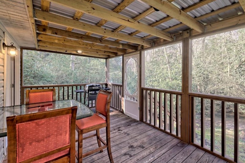 For home entertainment options, WiFi is provided and there are two flatscreen TVs in the home including one with a DVD player. Or step out back and relax to the sound of the babbling brook from your private hot tub. The covered front porch offers a swing where you can dive into the pages of a book even if the rain is falling. Note that your well-behaved dog is welcome to join your during your stay for a nominal daily fee.