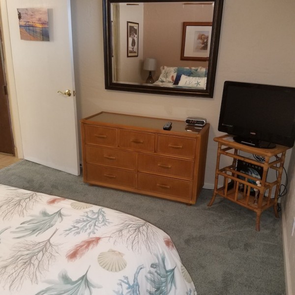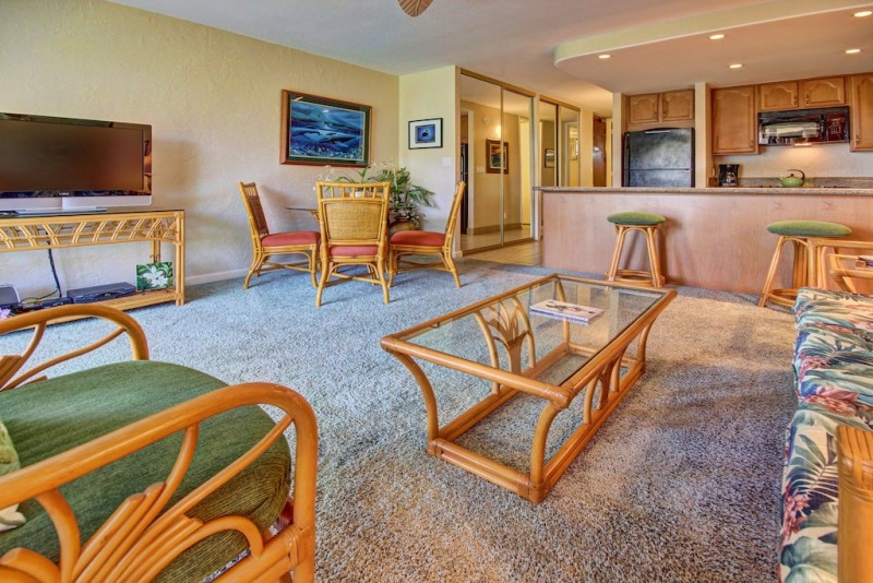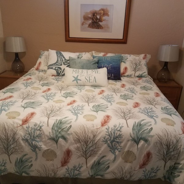 The unit is furnished in a light tropical décor with a touch of vintage and modern Hawaiiana. Before going to sleep, relax and curl up in front of our LCD HDTV and DVD player. The bedroom features a plush king size mattress and the sofa has a thick 8 inch mattress for the comfort of extra guests.